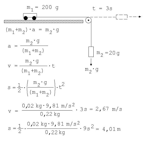 1. Ein 200 g schwerer Wagen steht auf einer waagrechten Ebene. Vom Wagen geht ein Faden aus, er läuft über eine Rolle abwärts und trägt am anderen Ende ein 20g-Gewicht.