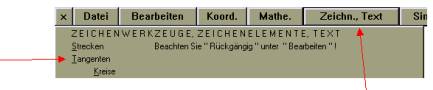 Die oben gegebene Aufgabe kann mit „Mathe.-Physik“ leicht gelöst werden. Nach Wahl von „Koordinatenanzeige ein“ werden die in Abb. 3 mit roten Pfeilen markierten Menüzeilen angeklickt. Nun kann nach Anklicken des Koordinatenursprungs A eine Strecke variabler Länge und Steigung aufgespannt werden (siehe Abb. 2). Diese wird um A gedreht, bis am oberen Rand des Bildfeldes die Steigung m = 10 cm/s angezeigt wird. Mit der Strecke erscheint ein Kreuz über A, dessen y-Koordinate bei konstanter Streckenlänge der Streckensteigung proportional ist. Hat man die Strecke mit Mausklick auf eine bestimmte Steigung festgelegt (z.B. 10cm/s), kann nur noch die Streckenlänge verändert werden. Die y-Koordinate des Kreuzes ist bei konstanter Steigung dieser Länge proportional. Ist die Länge so eingestellt, dass das Kreuz auf einer dafür vorgesehenen Markierung z.B. der 10 cm - Markierung liegt, wird die Streckenlänge L mit Mausklick fixiert. Die Strecke verschwindet.