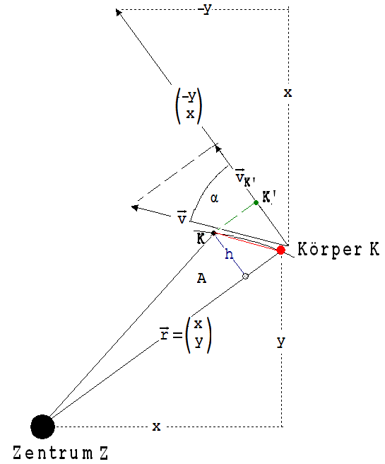 A = ½ ·h ·|r| ; vA = A / Δt = ½·(h /Δt) ·|r| (h / Δt) = |vK'| ist die Geschwindigkeit von Kʼ, der Projektion von K auf den Vektor {-y,x}. {-y,x} bildet mit r einen rechten Winkel. vA = A/ Δt = 0,5·|vK'| ·|r| Da {-y,x} den gleichen Betrag wie r hat, können wir |r| durch |{-y,x}| ersetzen. vA = ½ ·|vK'| ·|{-y,x}|; |vK' | = |v|·cos (α) vA = |v| · |{-y,x}| · cos (α) |v| · |{-y,x}| · cos (α) = v· {-y,x} = -v1· y + v2 · x Skalarprodukt !