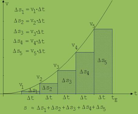 Anhand des t-v-Diagramms in den Abb. 1 – 4 soll der Weg ermittelt werden, der zwischen den Zeitpunkten t = 0 und t = tE zurückgelegt wurde. Der Zeitabschnitt zwischen t0 und tE wird in kleine Δt eingeteilt. Wenn sich die Geschwindigkeit in einem solchen Zeitabschnitt Δt nur wenig ändert, dann kann die Wegänderung Δs in Δt durch das Produkt v·Δt ausgedrückt werden. Durch Summation aller Δs erhält man den gesuchten Weg s.