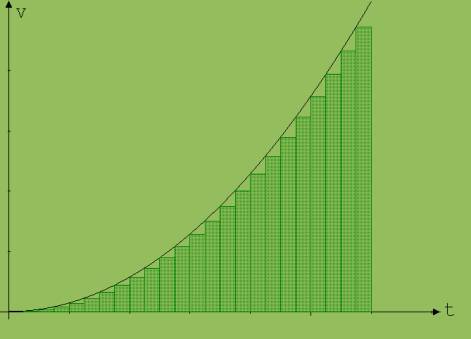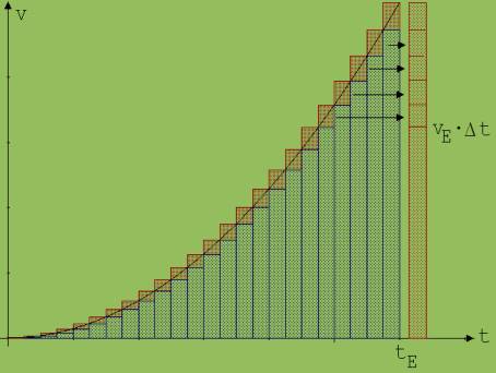 Die in Abb. 1 angedeutete Schätzung von s ist sehr grob. Zur Verbesserung der Rechnung muss Δt verkleinert werden. An der Abb. 4 ist erkennbar, dass die Summe der Δs mit kleiner werdendem Δt gegen einen Grenzwert strebt. Die Abweichung von dem maximal erreichbaren Wert ist kleiner als das Produkt aus Δt und der Endgeschwindigkeit vE . Dieses Produkt strebt mit kleiner werdendem Δt gegen 0.