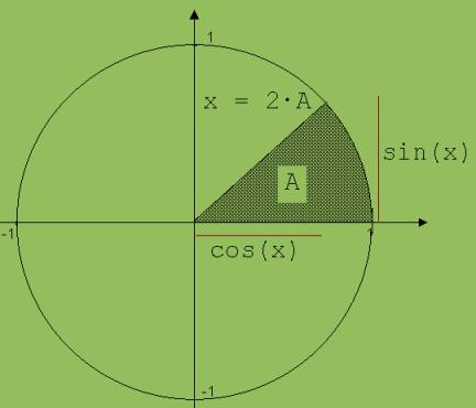 In der Abb. 1 ist die Bedeutung von sin(x) und cos(x) veranschaulicht. x ist der zum Sektor mit dem Flächeninhalt A gehörende Winkel im Bogenmaß. Für A gilt: A = x · Längeneinheit2 / 2 → x = 2·A / Längeneinheit2 Die Variable x in sin(x) und cos(x) kann demnach auch über den Flächeninhalt des Sektors definiert werden. Zu dieser Definition muss noch vereinbart werden, dass A bei einer Linksdrehung positiv und bei einer Rechtsdrehung negativ gewertet wird.