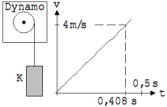 Zur Beantwortung dieser Frage dient die in der Abb. 1skizzierte Versuchsanordnung. Ein 5 kg schwerer Metallzylinder K spult während seines Falls einen Faden von der Welle eines Dynamos (Tachogenerator ) ab. Hierbei erzeugt dieser Dynamo einen elektrischen Strom, dessen Stärke der Geschwindigkeit proportional ist. Die Masse von K ist so gewählt, dass sich die hemmende Kraft des Dynamos nicht merkbar auswirkt. Während des Falls wird die Stromstärke des Dynamos in Abhängigkeit von der Zeit dargestellt. Es entsteht ein lineares