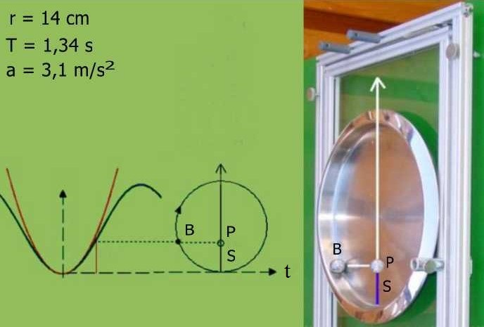 An der hier angepassten Parabel wurde der Wert a = 3,1 m/s2 ermittelt. Die Beschleunigung a der Projektion P zeigt die Zentripetalkraft F an, die bei sehr kleinem s als nach oben (Bild!) gerichtet betrachtet werden kann.