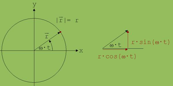 r = {r·cos(ω·t) ; r · sin(ω·t) } ; v= {-r·ω·sin(ω·t) ; r·ω·cos(ω·t) } ; a = {- r·ω2 · cos(ω·t) ; -r ·ω2 · sin(ω·t) }