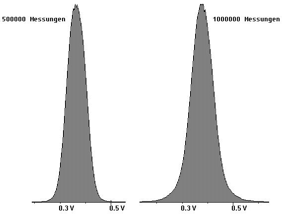 In den Abb. 11 und 12 sind Ergebnisse dargestellt, die im Messbereich ±1V aufgenommen wurden. Deutlich ist zu sehen, wie die Diagramme mit zunehmender Anzahl von Messungen mehr und mehr eine Glockenform annehmen.