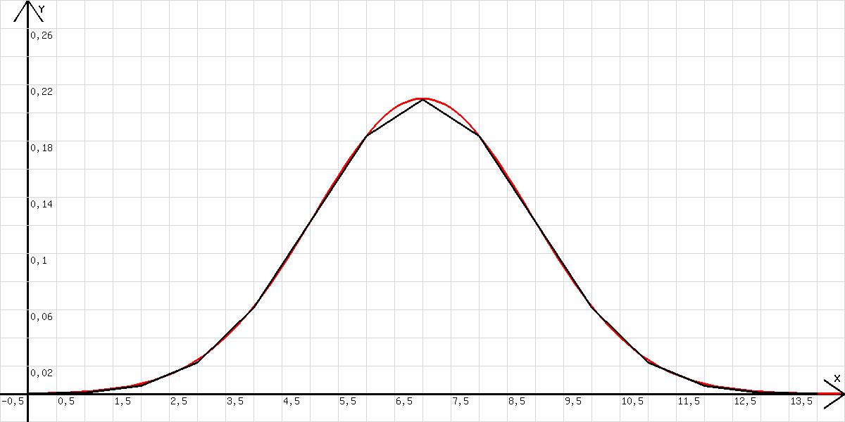 Das Diagramm (Binomialverteilung) in der Abb. 1 zeigt die Wahrscheinlichkeiten zu verschiedenen k = x für den Fall (m =14, p = q = 0,5). Es wird mit n=20;p=0,5;m=14;x=k; z=m!/(k!*(m-k)!)*p^m; k=k+1; l=x erzeugt ( pm = pk·q(m-k), p = q !) .