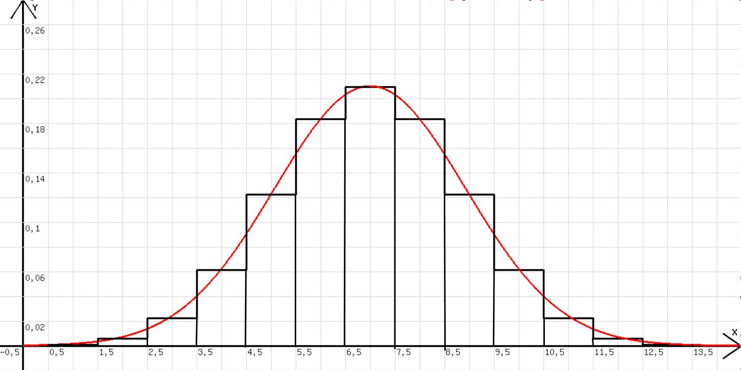 Mit n=20; x=x+0,01; k=int(x); k=int(x); u=k; v=14!/(k!*(14-k)!)*0,5^14; y=0,21*exp(-0,135*(x-7)^2); l=x wird die Binomialverteilung dargestellt und ihr zugleich der Graph (rot) der Funktion y=a · e-b*(x-m/2)^2 mit a = 0,21 und b = 0,135 angepasst (siehe Abb. 2).