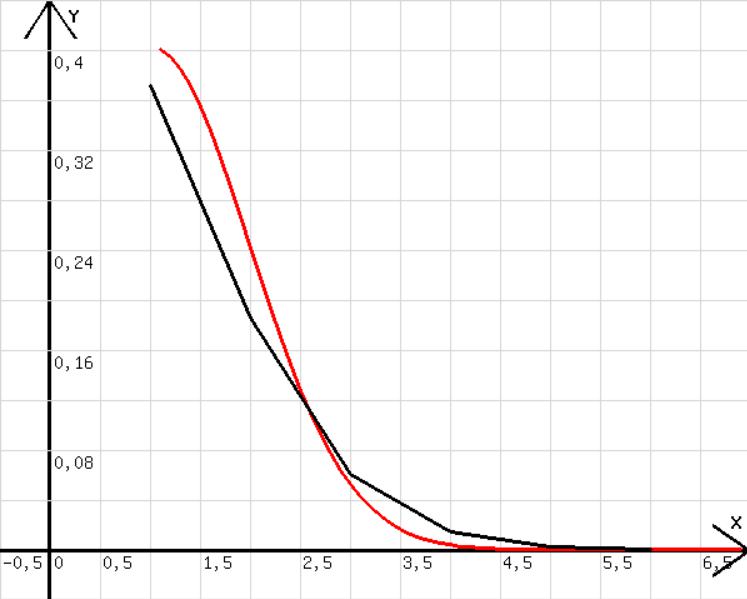 In der Abb.7 ist eine Binomialverteilung mit m = 50 und p = 0,02 (Anfangswert von x = 1) dargestellt. Es ist erkennbar, dass bei kleinem p die Exponentialfunktion (rot) erheblich von der Binomialverteilung abweicht. Wenn p sehr klein ist, dann passt zur Binomialverteilung eine von dem Mathematiker Poisson vorgeschlagene Annäherungsformel .