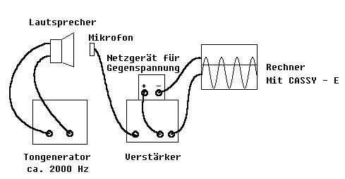Ein 2000 Hz - Ton wird mit einem Mikrofon aufgenommen und nach Verstärkung des Signals auf ±1,5V mit Hilfe Rechners mit AD-Wandler (CASSY - E) registriert (siehe Abb. 9). Durch eine gegen das Messsignal wirkende konstante Gegenspannung erreicht man, dass die positiven Halbwellen höchstens 0,5 V erreichen (siehe Abb.10 ). So können die Höhen der Spannungsspitzen in den empfindlichen Messbereichen ±1V und ± 0,3 Volt gemessen werden, in denen die Schwankungen des Messsignals gut erkennbar sind. Je Sekunde werden 2000 Spannungsspitzen ausgemessen. Der Messbereich wird vom Rechner in 256 gleich große Intervalle aufgeteilt. Über jedem Intervall errichtet der Computer auf seinem Bildschirm eine senkrechte Strecke, deren Länge proportional zur Zahl der Messwerte ist, die je Sekunde in dieses Intervall fallen.