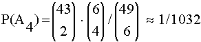 Ein zu A4 gehörendes Ergebnis erhält man, indem man aus den 6 richtigen Zahlen 4 Zahlen auswählt und diese Kombination dann mit einer Zweierkombination aus den 43 falschen Zahlen verbindet. Da es insgesamt 6! / (4 ! · 2!) Viererkombinationen aus 6 angekreuzten Zahlen gibt und diese Kombinationen mit 43! /( 2! · 41!) verschiedenen Zweierkombinationen verbunden werden können , gilt für P(A4):