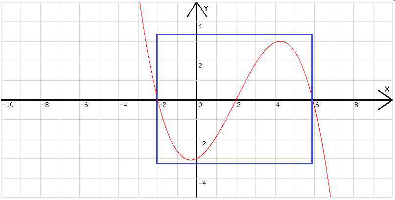 In der Abb. 3 ist der Graph zu der Funktion y=-3+0,5·x+0,75·x2-0,125·x3-0,00025·x4 zu sehen. Der Abschnitt innerhalb des blauen Rechtecks erstreckt sich von x= -2 bis x =5,9. Er wird als Periode einer periodischen Funktion mit p = 7,9 aufgefasst.