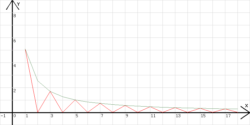 Das Diagramm in der Abb.7 ist ein Amplitudendiagramm (rot), welches nach den bj , aj – Wertepaaren mit der Programmzeile n=56; L=L+1;j = L ;x=L; y= wrz(xT(j)^2+yT(j)^2); z=wrz(xT(1)^2+yT(1)^2)/j erzeugt wird. Es stellt die Amplituden cj in Abhängigkeit von j dar.