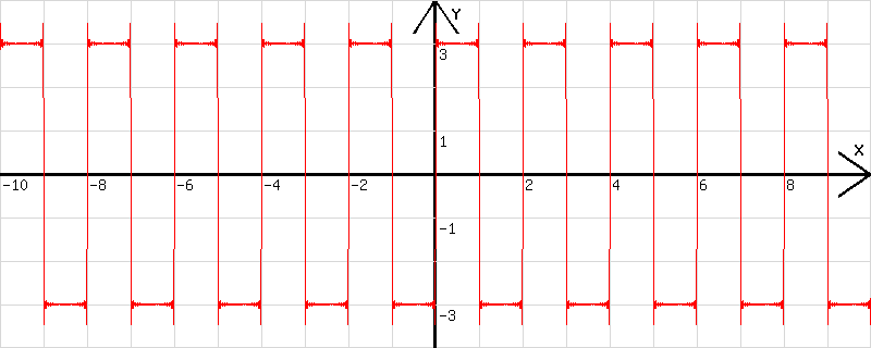 Erheblich mehr Sinusfunktionen werden für eine Anpassung an das Diagramm einer Rechteckfunktion y =4 · sgn(sin(x)) (siehe Abb. 5) benötigt. Auch mit sehr vielen Sinusfunktionen können die Ecken der Rechteckfunktion nicht richtig abgebildet werden (Gibbsches Phänomen). Unstetigkeiten erschweren eine Anpassung.