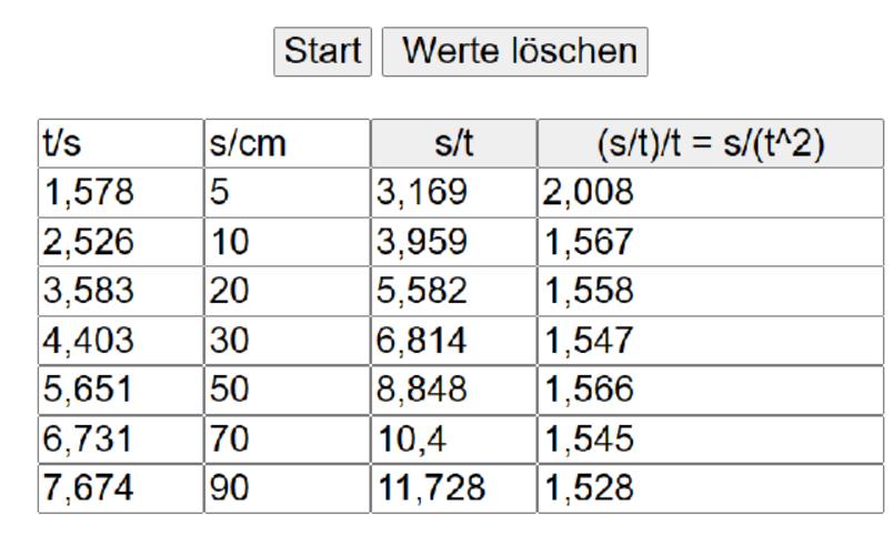 Eine Auswertung der Tabelle (siehe Abb.2) mit (s/t)/t = s/t2 = y/x2 zeigt an, dass die Vermutung v~ x zutrifft. Die geringen Abweichungen unter den Werten sind auf Ungenauigkeiten bei der Messung zurückzuführen.