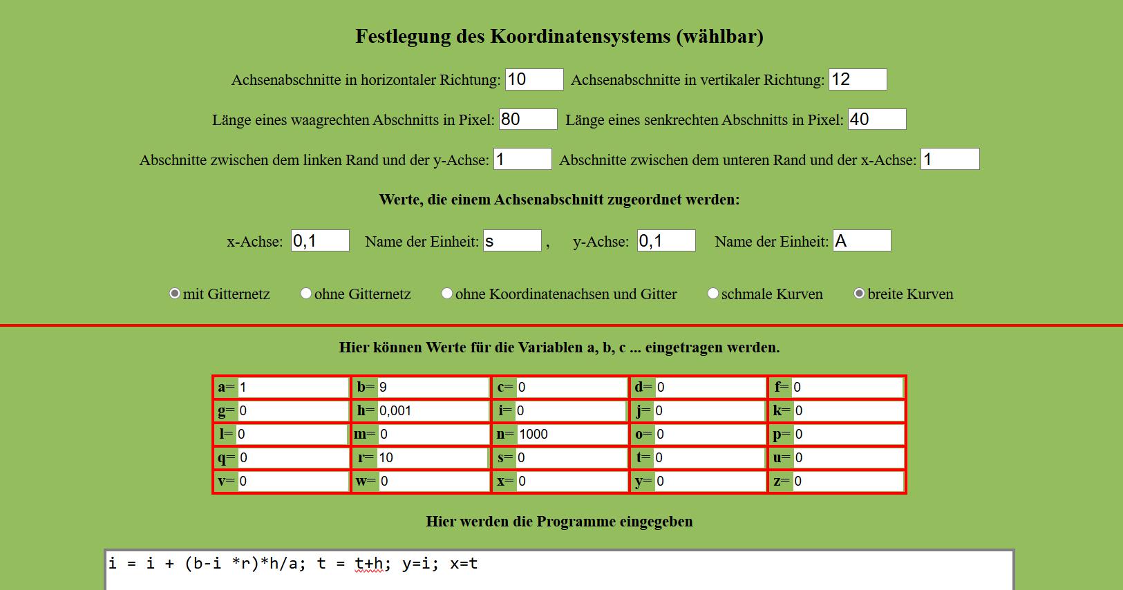 Mit dem nachfolgenden Programm wird die Stromstärke in Abhängigkeit von der Zeit unter der Bedingung (L=1H, R =10 Ohm, UB = 9V, h =0,001 s) dargestellt.