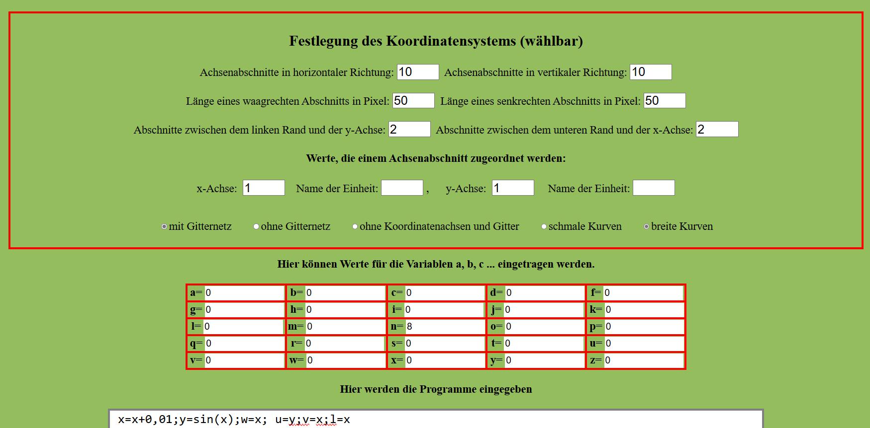 Mit dem Programm x=x+0,01;y=sin(x); w=x; u=y;v=x;l=x wird die Sinusfunktion y=sin(x), deren Umkehrrelation, sowie die Gerade w=x dargestellt. Es wird deutlich dass der Graph der Umkehrfunktion von y=sin(x) ein Spiegelbild von y=sin(x) bezüglich der Geraden y = x (w=x) ist. Die Einstellungen zum Ablauf der Programms sind in der Abb.2 erkennbar.