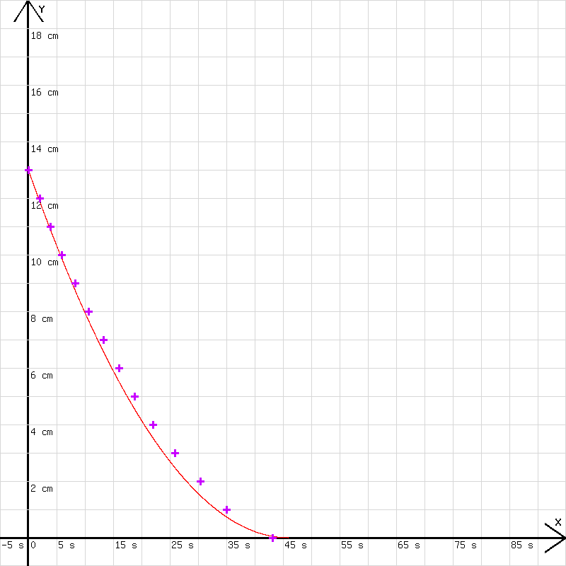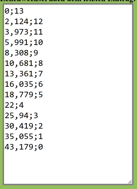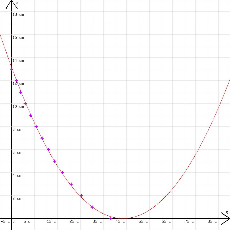 Das Experiment beginnt mit der Abnahme des Flaschendeckels. Danach läuft das Wasser in die Schale unter der Flasche. Der Button „Zeit“ (siehe Abb.8) wird immer dann angeklickt, wenn der Wasserspiegel eine der genannten Markierungen erreicht. So entsteht eine Zahlenfolge, wie sie in der Abb. 8 sichtbar ist. Diese Zahlenfolge wird zur Auswertung in das Tabellenfenster von http://g-hoehne.de/sim.html (siehe Abb. 9) übertragen. Den Zeitwerten t dieser Folge werden die dazu gehörenden Abstände y der Wasseroberfläche von der untersten Markierung angefügt. Diese Daten in sim.html werden an das auf der Internetseite des Verfassers befindliche Rechen- und Grafikprogramm sim.php gesendet. sim.php erzeugt damit das in der Abb. 10 sichtbare Diagramm. Den t; y- Wertepaaren sind Punkte P mit den Wertepaaren als Koordinaten zugeordnet ( x = t ).