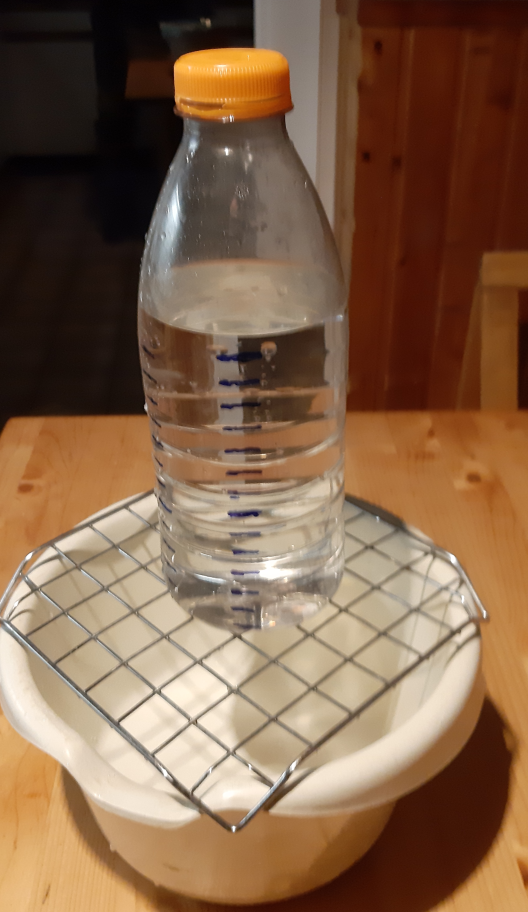 Die fast vollständig gefüllte, oben verschlossene Plastikflasche wird auf ein Gitter gestellt, welches auf einer Schale aufliegt (siehe Abb. 7). Der Wasserstand, der sich nach dem Ausfließen des Wassers einstellt, ist durch einen Strich in Bodennähe der Flasche markiert (der Flaschenboden ist nicht eben). Nach oben hin folgen im zylindrischen Bereich der Flasche 13 weitere Markierungen in jeweils 1cm Abstand.