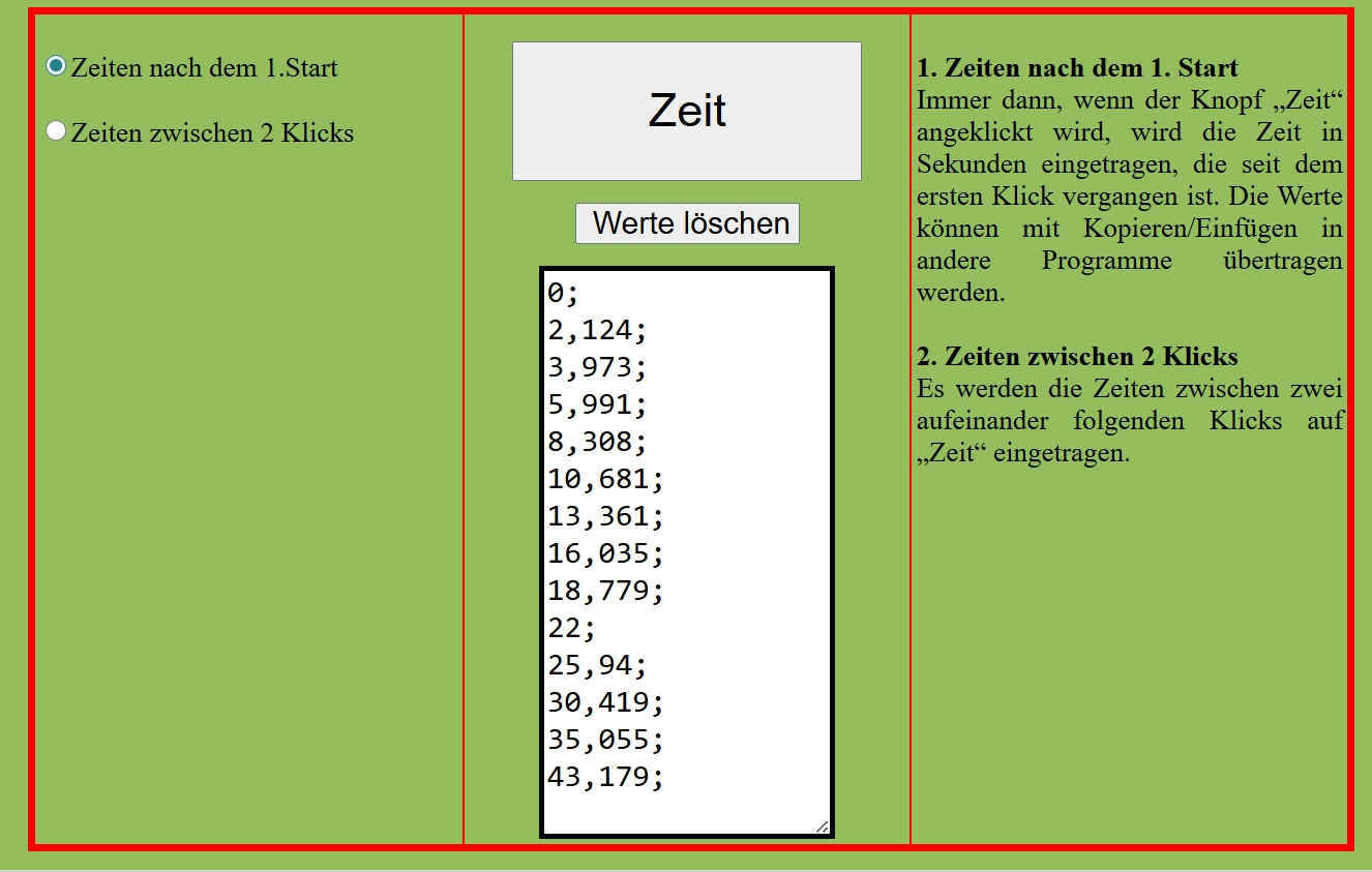 Zur Zeitmessung steht ein Programm unter http://g-hoehne.de/Zeit.php zur Verfügung (siehe Abb.8). Beim ersten Klick auf den Button „Zeit“ wird die Zeitmessung gestartet und der Wert 0 in ein Textfeld eingetragen. Bei jedem darauf folgenden Klick wird die Zeit, die seit dem ersten Klick vergangen ist, in das gleiche Feld geschrieben.