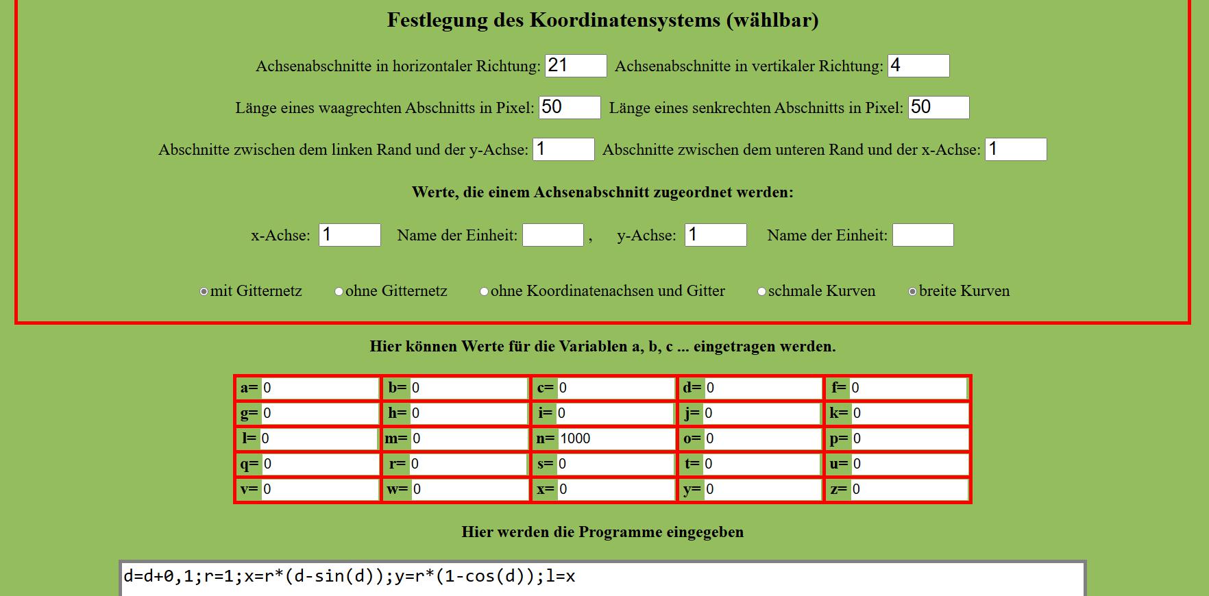 Zum Zeichnen einer Zykloide oberhalb der x-Achse werden die nachfolgenden Zeilen in das Programmfenster geschrieben. In der Abb. 3 sind die Einstellungen zur Darstellung des Funktionsgraphen zu sehen.