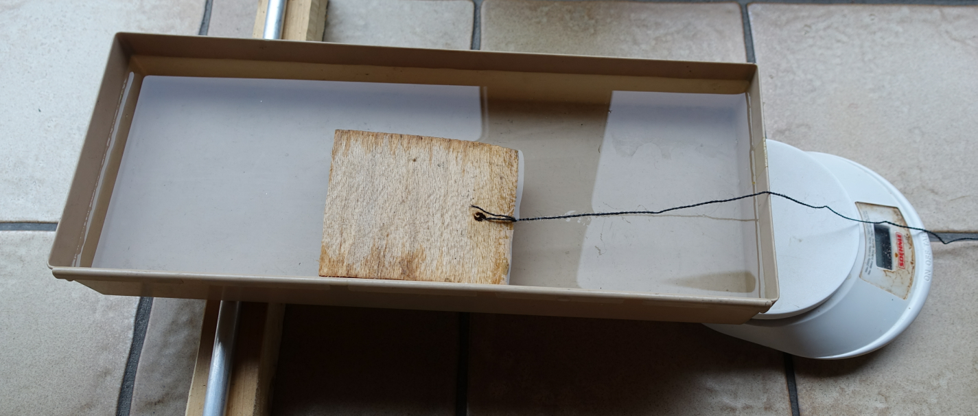 Aus der Schale wird soviel Wasser herausgegossen, dass der Holzklotz bei einem geringen Wasserstand fest auf dem Boden der Schale liegen kann. Daraufhin wird der Holzklotz wie im ersten Experiment über die Schale von links nach rechts zur Waage hin gezogen. Hierbei nimmt die Anzeige der Waage deutlich zu.