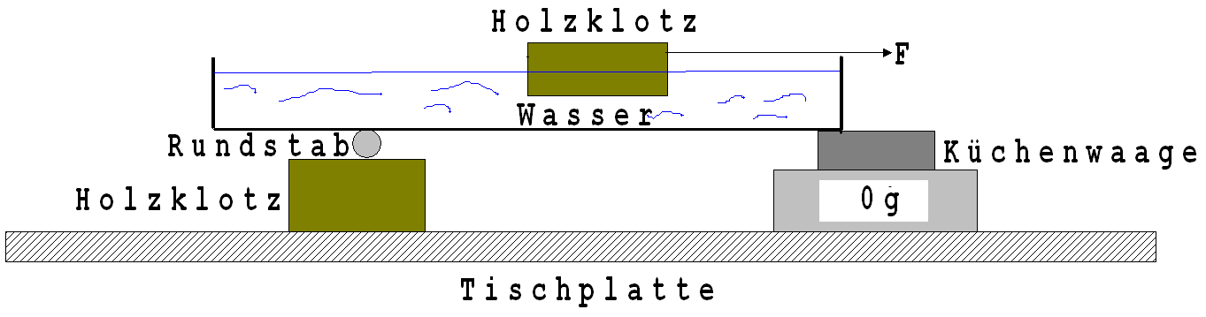 Das eine Ende einer mit Wasser gefüllten, rechteckigen 40 cm langen Schale wird von einer Küchenwaage gehalten (siehe Abb.1 und Abb.2). Die Schale ist als Hebel zu sehen, der auf einem Rundstab drehbar aufliegt. Ein zunächst über dem Rundstab auf dem Wasser schwimmender 150 g schwerer Holzklotz, wird wie in der Abb. 1 und 2 angedeutet langsam von links nach rechts an einem Faden zur Waage hin gezogen. Hierbei ist keine Gewichtszunahme an der anfangs auf 0 gestellten Waage erkennbar. Die Anzeige der Waage kann während des Ziehens geringfügig, maximal +2 g von dem anfänglichen Wert 0 abweichen. Wird nicht gezogen, dann stellt sich der Anfangswert 0 wieder ein. Als ein Grund für diese minimale Abweichung von 0 g kommt eine Welle vor dem Holzklotz in Frage.