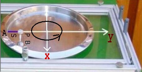 Wie in Abb. 1 angedeutet, rotiert eine Kugel B in einer auf der Experimentierwippe stehenden Schale mit konstanter Winkelgeschwindigkeit ω auf einer Bahn mit dem Radius r. ω = 2·π / T (T= Zeit einer Drehung). Das Diagramm zu y=r·sin(ω·t) in der Abb. 2 beschreibt die Bewegung des Punktes P, der senkrechten Projektion des Körpers B auf einen durch den Kreismittelpunkt gehenden Pfeil (y-Achse des zugeordneten Koordinatensystems). Die Beschleunigung von P bei sehr kleiner Abweichung s vom Punkt A zeigt an, wie B zum Kreismittelpunkt hin beschleunigt wird. Diese Beschleunigung a wird Zentripetalbeschleunigung genannt. Die beschleunigende Kraft m·a heißt Zentripetalkraft (m: Masse von B). Zur Bestimmung der Beschleunigung wird dem Bewegungsdiagramm von P ein Bewegungsdiagramm einer bei A beginnenden gleichförmig-beschleunigten Bewegung in Pfeilrichtung (s = b·t'2 ) angepasst (t': Zeit für den Weg s). Der Faktor b = (a/2) wird so gewählt, dass beide Diagramme sich bei kleinem s kaum unterscheiden (siehe Abb.2), dass demnach die zu s=b·t'2 passende Bewegung bei kleinem s mit der Bewegung von P übereinstimmt. Mit a = 2·b erhält man so die Beschleunigung von P bei A. Dies ist die Zentripetalbeschleunigung.