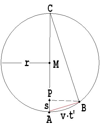 Der Funktionsterm der Parabel, welche die Bewegung der Projektion P bei kleinem s beschreibt, soll nun anhand der Abb.3 hergeleitet werden. Das Dreieck ABC ist nach dem Satz des Thales ein rechtwinkliges Dreieck. In der Zeit t' legt P während der Kreisbewegung von A nach B den Weg s zurück. Der Kreisbogen AB weicht bei kleinem t' nur sehr wenig von der Kathete AB ab. Es gilt somit nach dem Kathetensatz:
