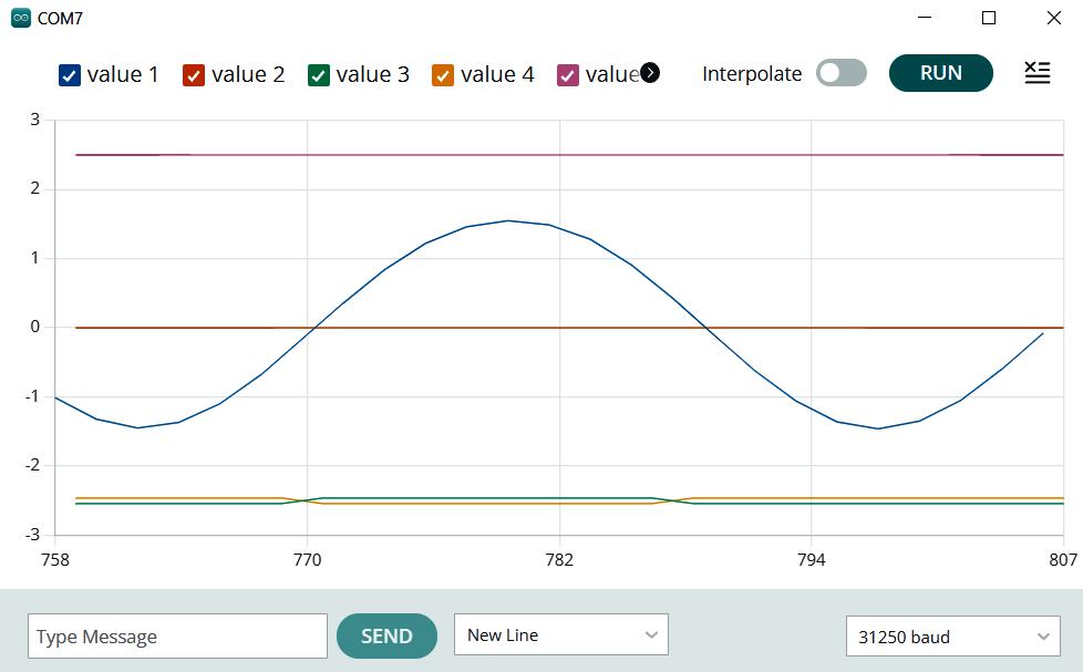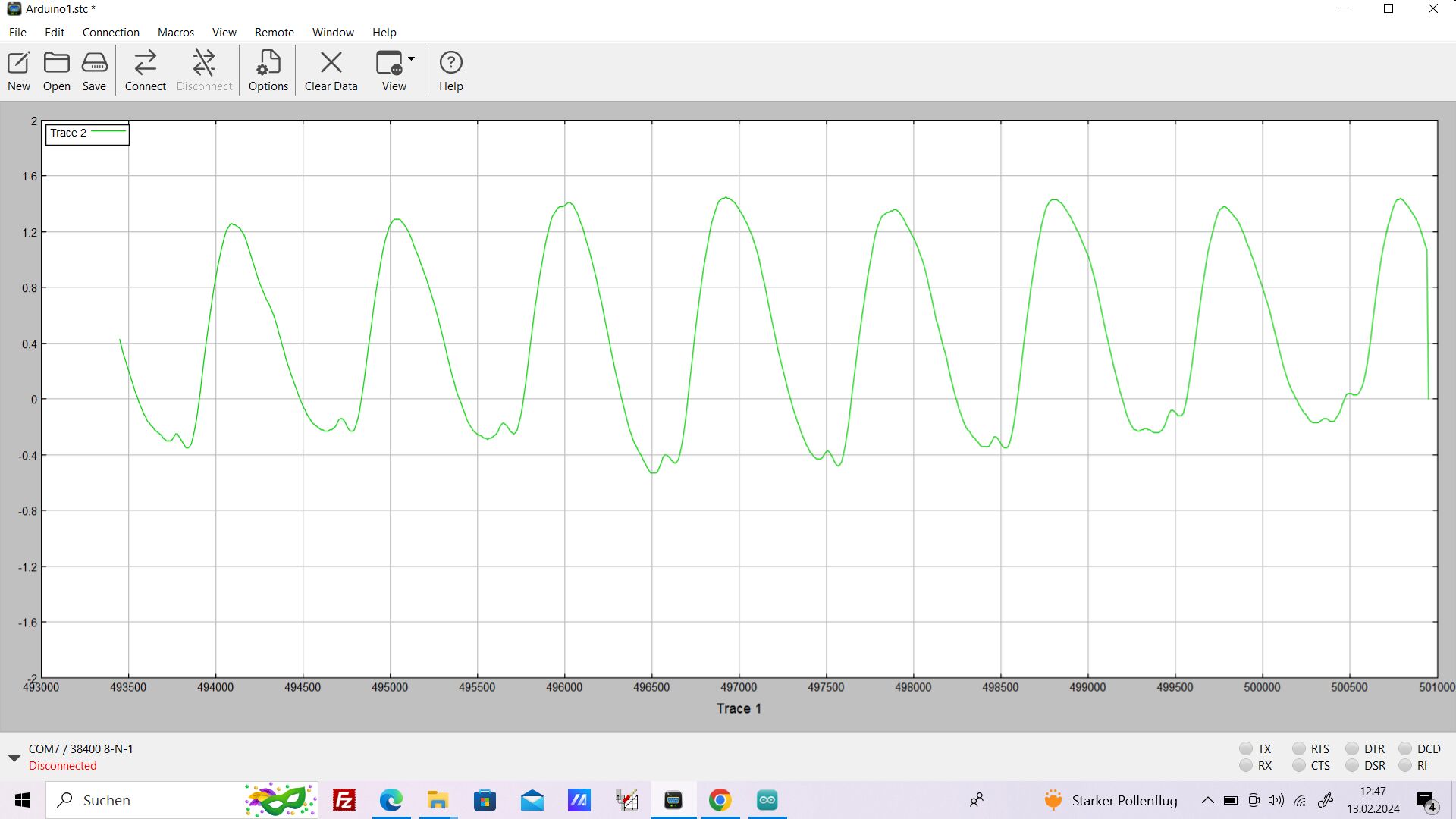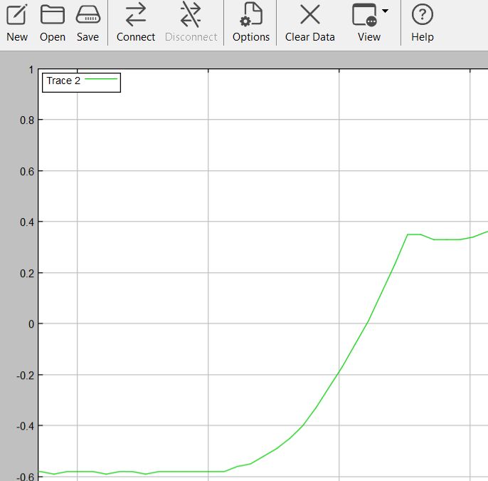 Das in der Abb.2 aufgenommene Diagramm wurde mit dem zu Arduino passenden Messprogramm CoolTerm aufgenommen. Das als Freeware erhältliche Coolterm (CoolTerm - Free download and software reviews - CNET Download ) ist erheblich leistungsfähiger als der zu Arduino gehörende serielle Plotter. Genauere Angaben zur Verwendung dieses Programms sind am Ende dieses Artikels.