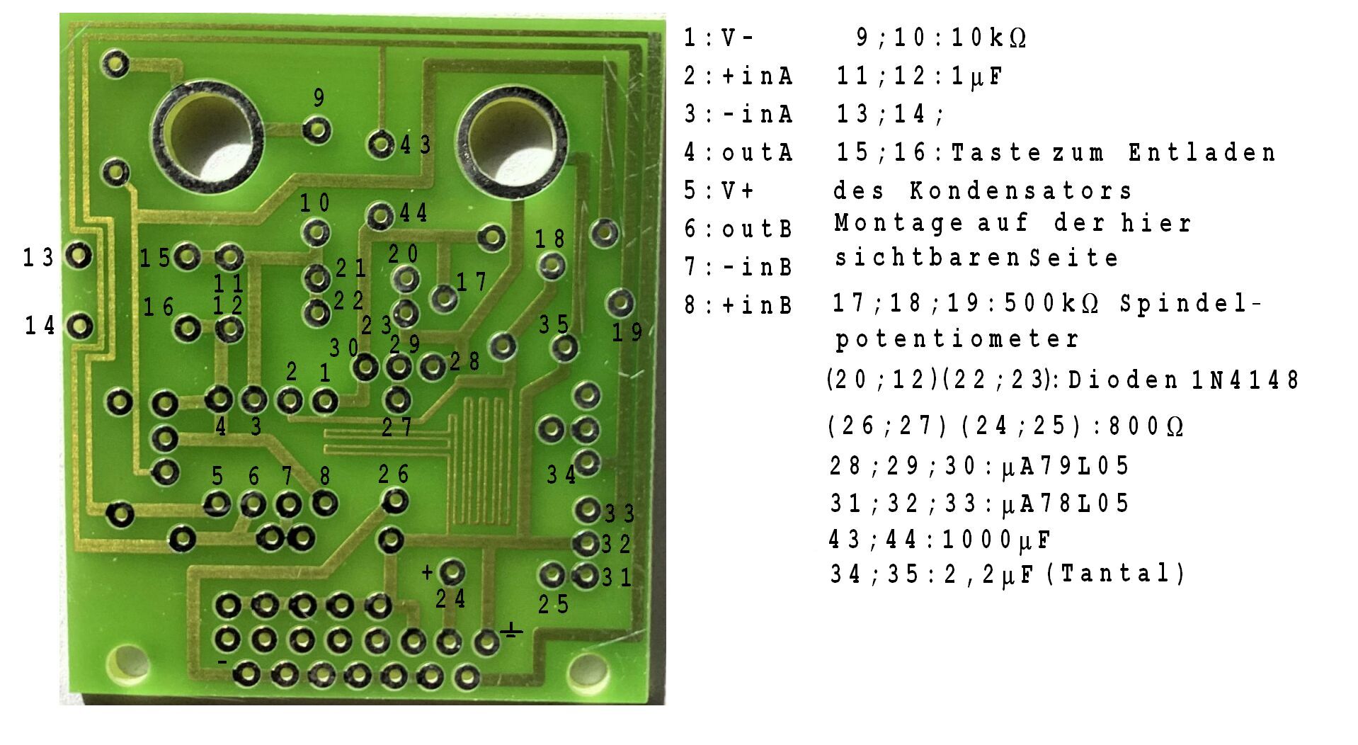 Das CASSY liefert in Bezug auf die Erde die Spannungen -12 und +12 V. Mit den Spannungsteilern μA78L05 und μA79L05 werden daraus die zum Operationsverstärker passenden Spannungen – 5 V und + 5V erzeugt. Der 1000 μF Kondensator und der Tantalkondensator dienen der Stabilisierung der daraus resultierenden 10V-Spannung. Die 800Ω-Widerstände vor den Spannungsteilern sollen im Falle eines Kurzschlusses innerhalb der Schaltung sowohl das CASSY als auch die Spannungsteiler vor Überlastung schützen. Mit dem 500 kΩ-Spindelpotentiometer wird in Verbindung mit dem 0,5Ω-Widerstand die sehr kleine Offsetspannung der Operationsverstärkers kompensiert. Das Spindelpotentiometer wird so eingestellt, dass bei der Eingangspannung 0 die Spannung zwischen outA und -inA ebenfalls 0 ist. Die beiden Dioden 1N4148 sollen den Operationsverstärker vor hohen Spannungen schützen, die bei Induktionsversuchen möglich sind. In der Abb.26 ist zu sehen, wie diese Schaltung auf der für das CASSY vorgesehenen Platine verwirklicht werden kann.