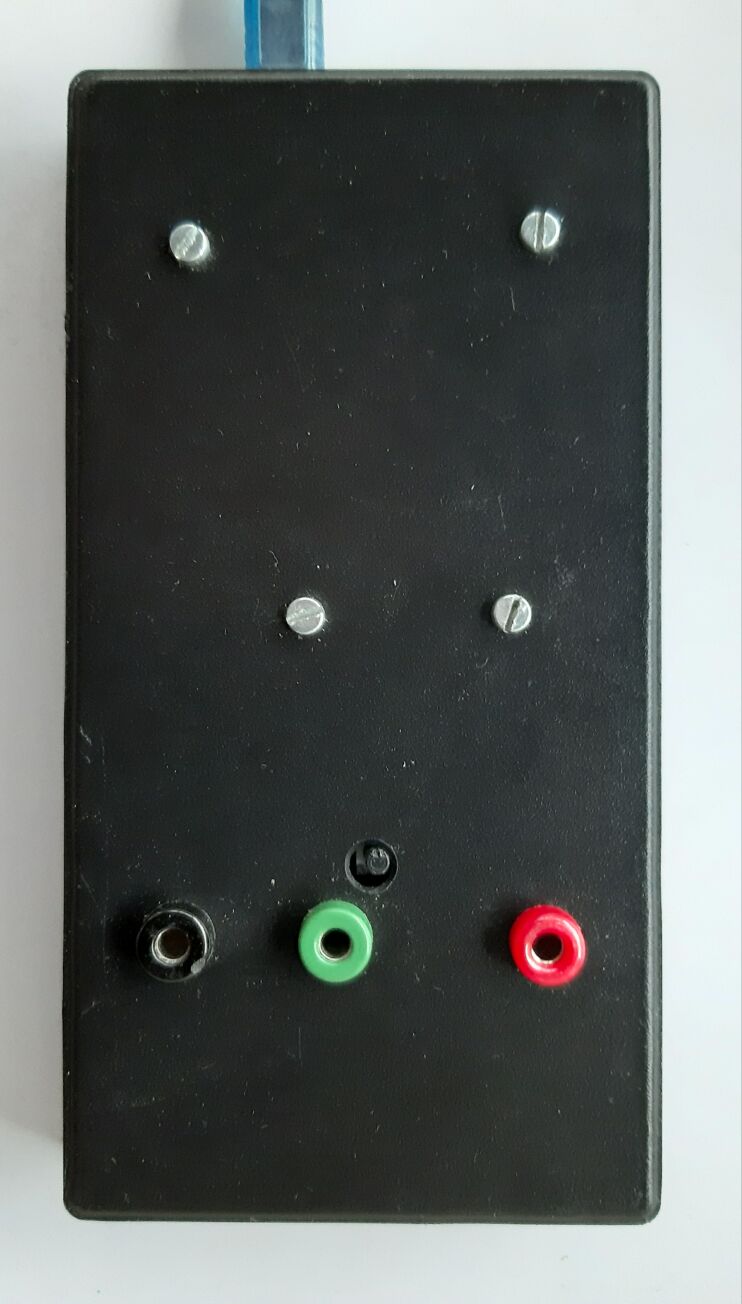 Der Integrator erhält seine Versorgungsspannung über die Anschlüsse GND und +5V auf dem Arduinoboard. Die Schwarze Buchse auf der Box (siehe Abb.30) ist an die Mitte eines Spannungsteilers aus zwei 1kΩ-Widerständen angeschlossen (siehe Abb.27). Die grüne Buchse ist über einen 10kΩ-Widerstand mit dem invertierenden Eingang (-inA) des Operationsverstärkers verbunden. Auf diese Weise ist der Integrator für Eingangsspannungen von -2,5 V bis +2,5V ausgelegt. Die Ausgangsleitung des Integrators ist an den Analogeingang A0 des Arduinoboards angeschlossen. Neben der grünen Buchse ist noch eine rote Buchse auf der Box (siehe Abb. 30) erkennbar. Diese ist an den Analogeingang A2 des Arduinoboards angeschlossen. Sie wurde angebracht, damit auch eine Spannung zwischen der schwarzen und der roten Buchse und nicht nur deren Integral gemessen werden kann. Vor den genannten Buchsen ist die Taste zum Entladen des Kondensators zu sehen.