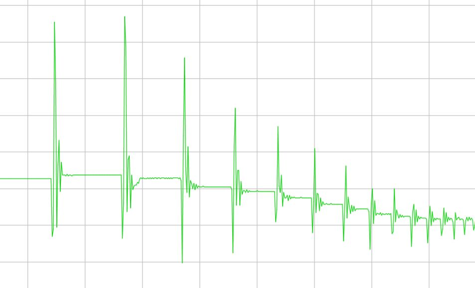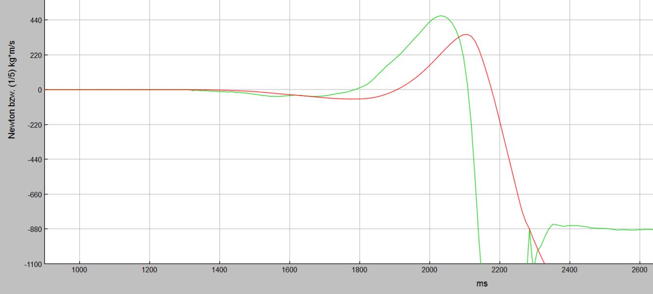 Abb. 11 sind zwei Diagramme zu sehen, die während des Absprungs einer Person vom Sprungbrett mit Arduino aufgenommen wurden. Das grüne Diagramm zeigt m·a an, die zur Beschleunigung nach oben aufgewandte Kraft. Das rote Diagramm beschreibt das Fünffache des Körperimpulses. Nach dem Absprung wird das Brett um die Gewichtskraft des Körpers entlastet, wobei sich die Kraft F des Bretts um -m·g = -880N ändert . Das Diagramm läuft kurzzeitig unter -880 N. Dieser Verlauf ist auf ein Abfederrn des Brett vom Boden nach dem Absprung zurückzuführen.