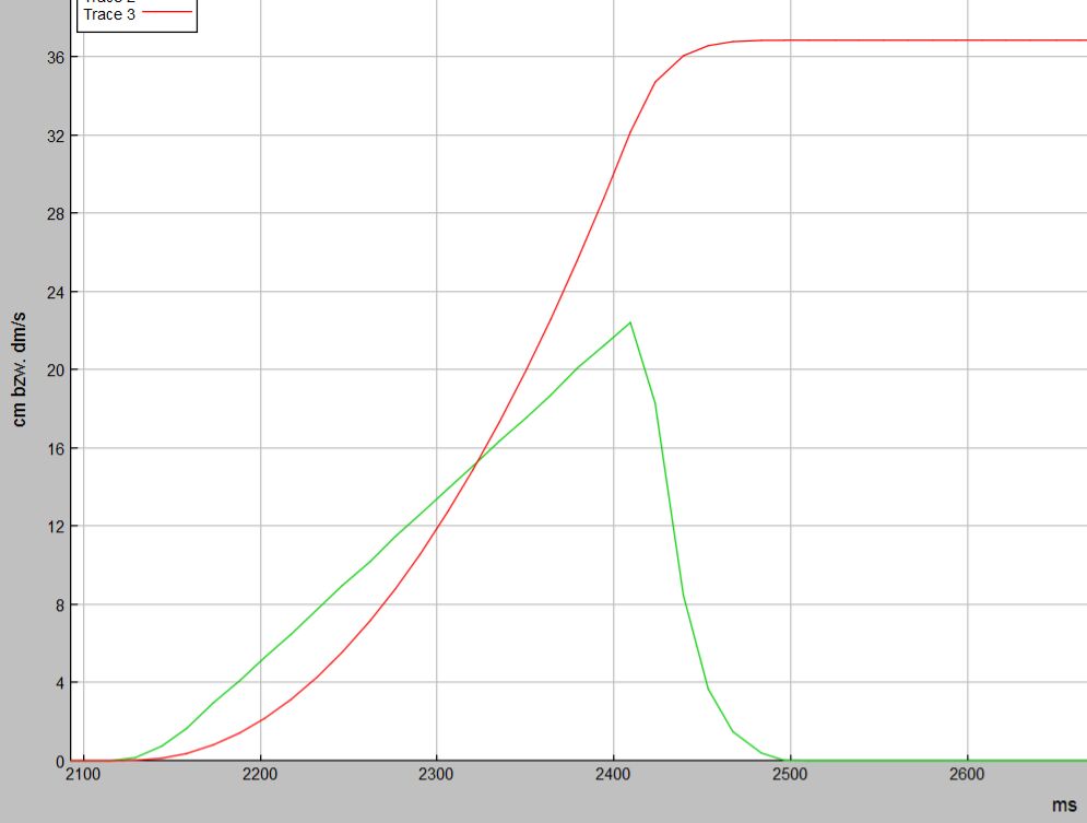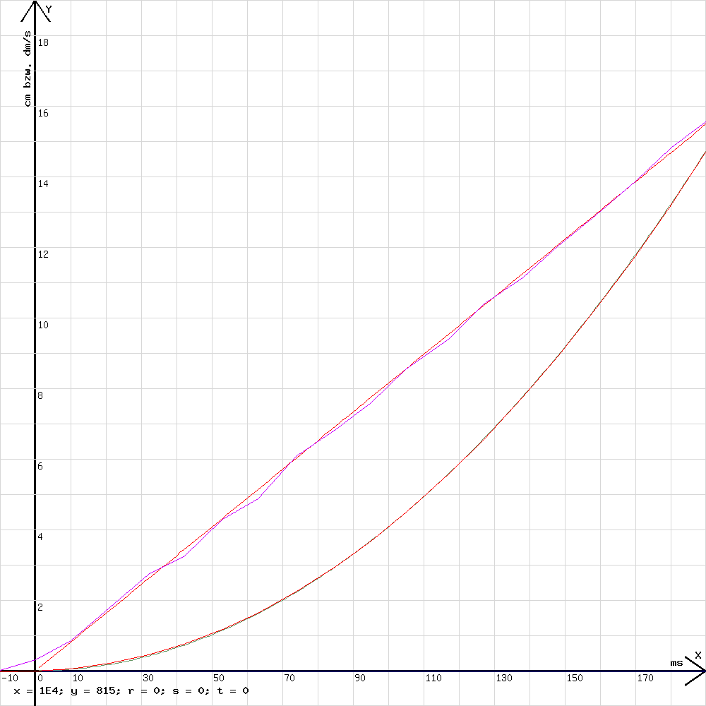 In der Abb.23 sind Diagramme zu sehen, die von dem schon mehrfach erwähnten Online- Grafikprogramm mit den in der Abb. 21 dargestellten Messergebnissen erzeugt wurden. Diese Diagramm wurde überzeichnet mit den Graphen zu y = 81,5*x/1000 und z=407*(x/1000)^2. Es ist zu beachten, dass die Geschwindigkeit in dm/s und der Weg in cm angegeben wird.
