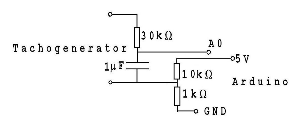 Das v-t-Diagramm (dm/s) sowie das s-t-Diagramm (cm) in der Abb.21 wurden mit diesem Programm während des in der Abb.20 dargestellten Versuchs aufgenommen. Dem Tachogenerator ist zur Glättung seines Ausgangssignals über ein RC-Glied (siehe Abb.22) an Arduino angeschlossen.