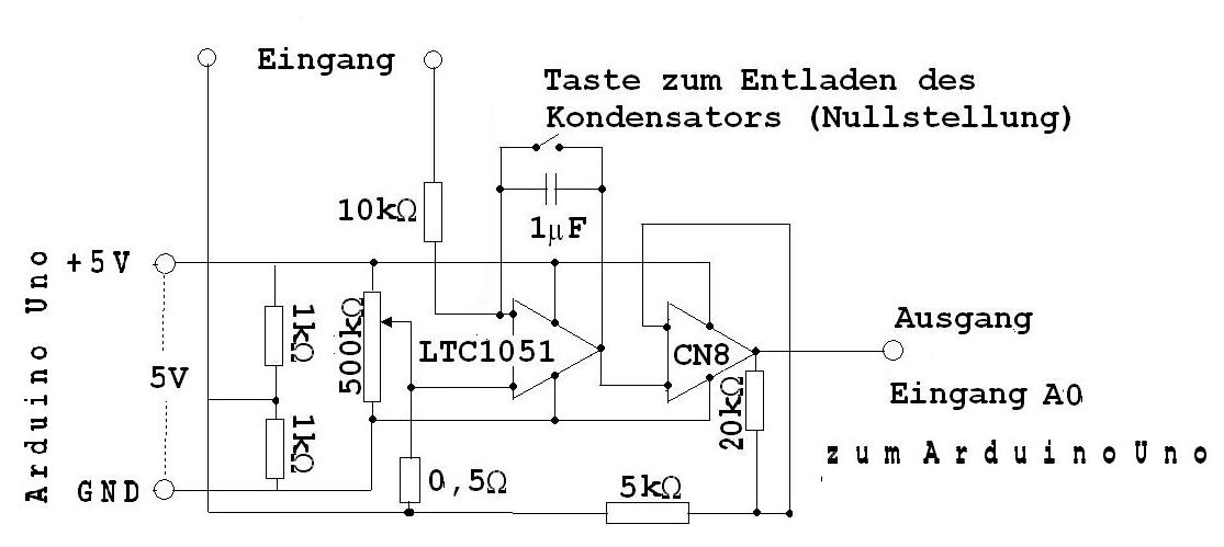 Zwei Schaltungen werden vorgestellt. Die erste ist für eine zum CASSY der Firma Leybold passende Box und die zweite ist zum Anschluss an Arduino. Der duale Operationsverstärker LTC1051 wurde für diese Schaltung gewählt, weil er im Vergleich mit anderen Operationsverstärkern wegen eines sehr geringen Temperaturdrifts sehr positiv auffällt. Übliche Temperaturschwankungen in einem Klassenzimmer wirken sich nicht merkbar auf sein Ausgangssignal aus. Von Amazon erhält man eine Packung mit 5 LTC1051 für 25€. Bei Conrad-Electronic oder Reichelt-Electronic kostet ein Exemplar ca. 10 €.