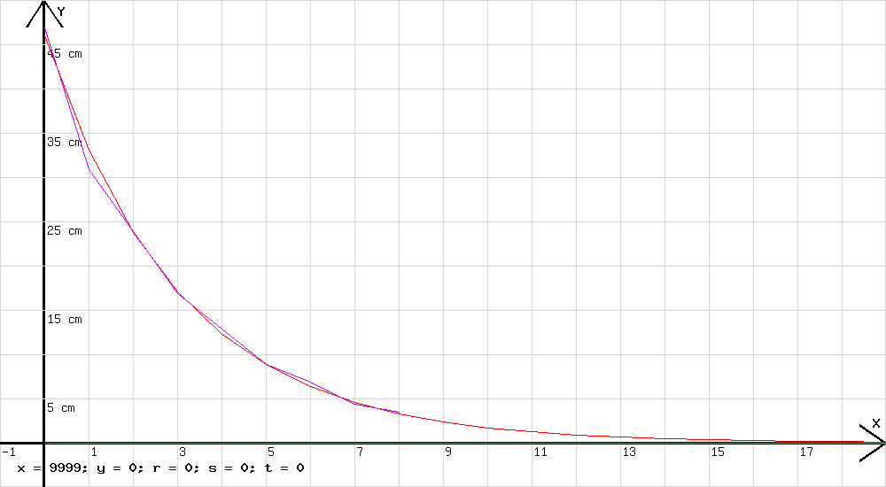 Auf das Brett fällt ein Ball . Er springt nach dem Aufschlag wieder hoch, fällt wieder auf das Brett usw. Hierbei wird das in der Abb.12 sichtbare Diagramm gezeichnet, an dem die Zeitpunkte der Aufschläge deutlich erkennbar sind. Mit der Zeit tx zwischen dem x. und dem (x+1). Aufschlag kann die Sprunghöhe sx nach dem x. Aufschlag berechnet werden ( sx = (g/2) ·(tx/2)2 ). Die zu x = 0, 1, 2 ... gehörenden Sprunghöhen sind in der Abb.13 als Punkte eines Streckenzugs dargestellt. Diese Punkte liegen auf dem Graf zu f(x) = 46 cm · e –0,33 ·x (siehe Abb.14). Der Sprunghöhe nach dem ersten Aufschlag ist x = 0 zugeordnet.
