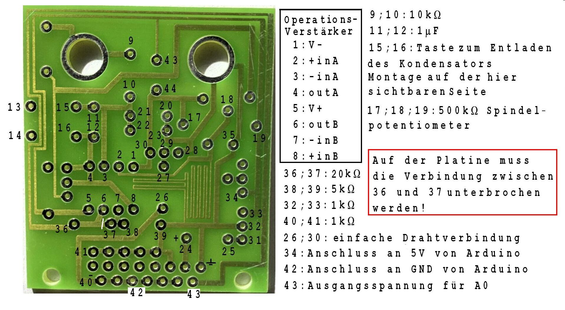 Der 0,5Ω-Widerstand ist auf der Platine als lange , dünne, hin und zurück laufende Leiterbahn zu sehen. Mit den Leiterringen um die kreisförmigen Öffnungen wird eine elektrische Verbindung zu zwei Bananensteckerbuchsen für die Eingangsspannung hergestellt. Zur Realisierung eines guten Kontaktes müssen diese Ringe mit Lötzinn überzogen werden. Die Platine wird an den genannten Buchsen festgeschraubt. Zum Anschluss an das CASSY wird ein gewinkelter Stecker (Typ D-SUB ST 15 EU) an die Platine gelötet. Der Operationsverstärker sollte nicht angelötet, sondern auf einen dazu passenden Sockel (GS8) gesteckt werden.