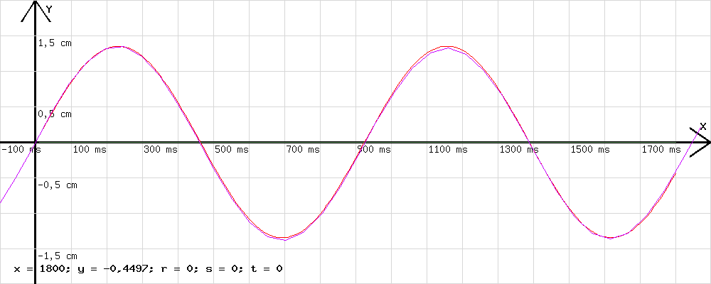 In der Abb. 3 ist ein Diagramm (violett) zu sehen, welches nach dem gerade erwähnten Onlineprogramm anhand der Messwerte von Abb.2 erzeugt wurde. Neben dem aus den Messwerten gebildeten Diagramm ist eine Parabel (rot) zur Funktion y=5E-6*x^2 (Zeit x in Millisekunden !), welche dem Diagramm der Messwerte angepasst wurde.