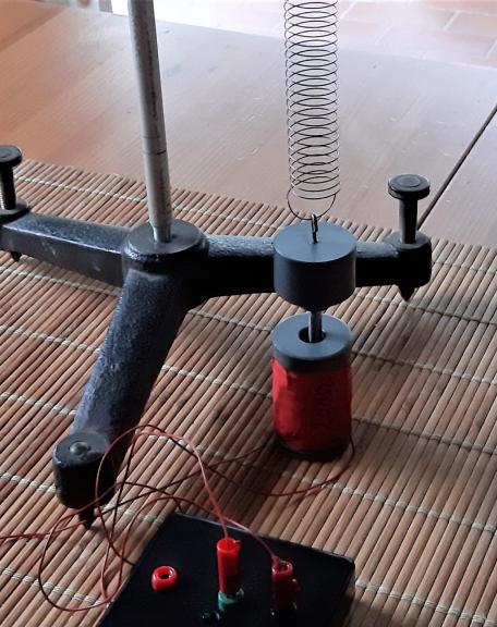 In der Abb. 6 ist das nächste Experiment dargestellt. Ein Gegenstand schwingt an einer Schraubenfeder auf und ab. An ihm hängt ein kleiner Stabmagnet, der in eine Spule aus gelacktem Kupferdraht eintaucht. Er induziert eine elektrische Spannung in die Spule, unter der Ladungsverschiebungen stattfinden, die den entsprechenden Verschiebungen des Magneten proportional sind. Ein Schwingungsdiagramm wird gezeichnet (siehe Abb.7). Es ist erkennbar, dass es mit dem seriellen Plotter von Arduino aufgenommen wurde. Die Spule bildet mit dem Magneten einen sehr empfindlichen Längensensor. Die Abb. 8 wurde mit dem erwähnten Onlineprogramm erzeugt. Sie zeigt das Schwingungsdiagramm zusammen mit dem Graphen einer Sinusfunktion.