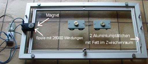 Zur Messung der Drehung ist am äußeren Rahmen, in einem Gehäuse verborgen, eine Spule mit vielen Windungen aus gelacktem Kupferdraht befestigt (siehe Abb. 17 und Abb. 19). In diese Spule ist ein sehr starker, kleiner Stabmagnet eingeführt, der an der beweglichen Wippe befestigt ist.