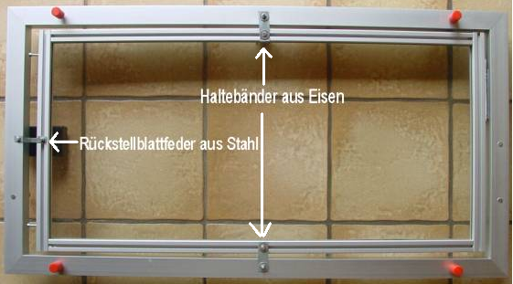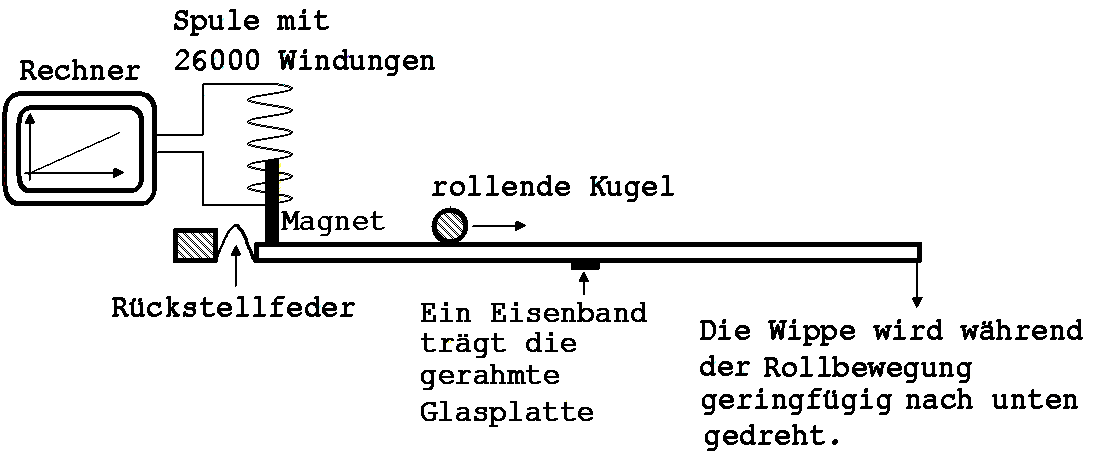Eine gerahmte Glasplatte ist in ihrer Mitte (siehe Abb. 17) mit zwei dünnen Eisenbändern an einem Aluminiumrahmen befestigt. Die Eisenbänder lassen eine Drehung der Platte um deren Mitte gegen den Widerstand einer Blattfeder (Rückstellfeder) am linken Rand der Wippe zu (siehe Abb. 18). Eine geringe Drehung erfährt die Platte z.B. dann, wenn eine Kugel oder ein Experimentierwagen über sie rollt (siehe Abb.19). Die der Verschiebung der Experimentierobjekts proportionale Drehung ist bei einer Masse m des Objekts < 0,15 kg geringer als 0,1° und hat somit keinen merkbaren Einfluss auf die Bewegung.