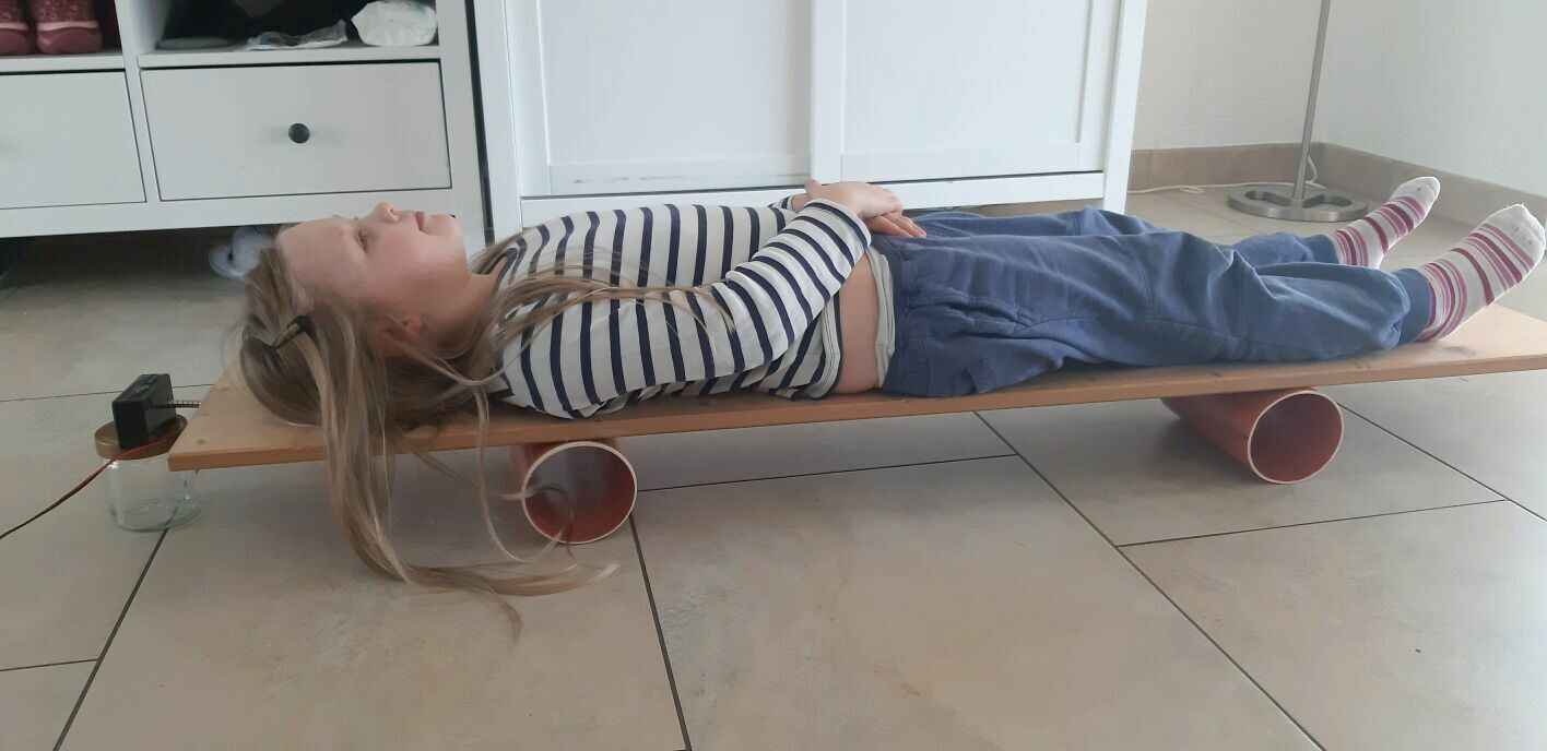 Eine Person liegt auf einem Brett, welches auf Wasserrohren aus Hartplastik gelagert ist (siehe Abb.15). Es handelt sich um orangefarbene Rohrstücke, welche in der Erde verlegt werden. Wenn Blut aus einer Herzkammer gepumpt wird, dann bewegt sich der Körper mit dem Brett zur Erhaltung des Schwerpunkts entgegen der Strömungsrichtung. Diese Bewegung wird von einem Rechner in einem Ballistokardiogramm (siehe Abb. 16) dargestellt. Zur Registrierung der Verschiebung ist am einen Ende des Bretts ein Magnet befestigt, der in eine Spule mit ca. 4000 Windungen hineinragt.