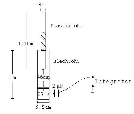 In ein eisernes Regenabflussrohr, welches über einen Integrator geerdet ist, fällt ein Plastikrohr, welches durch Reiben mit einem Stück Papier elektrostatisch aufgeladen wurde (siehe Abb. 1).