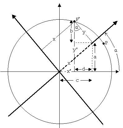 Die Koordinaten werden in einer Skizze ( Abb. 5) dargestellt. P' und P sind die Orte nach und vor der Drehung.