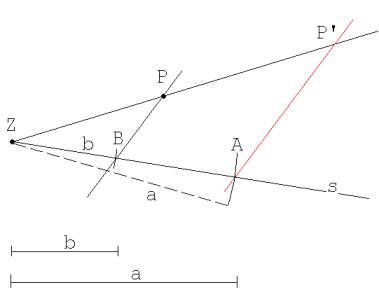 Nach Wahl eines Streckungszentrums Z soll zu einem Punkt P der Bildpunkt P’ konstruiert werden, der bei Abbildung von P mit S(Z; m) entsteht. m ist das Verhältnis zweier gegebener Strecken a und b.