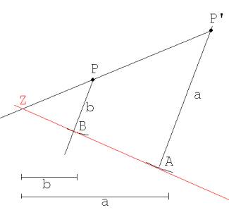 3. Auf diesen Geraden bestimmen wir zwei Punkte A und B, die von P und P’ die Abstände a und b haben.
