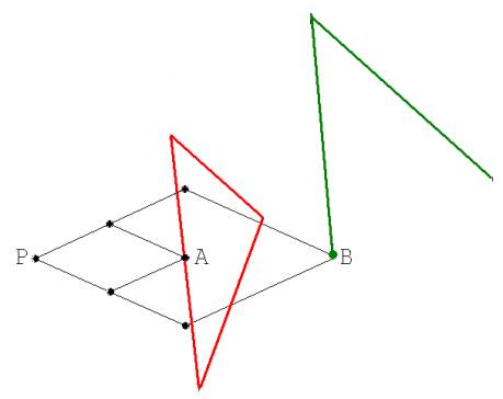 In der Abb. 1 sehen wir ein aus Stäben zusammengefügtes Doppelparallelogramm. Die Stäbe sind gelenkig miteinander verbunden. Das mit P gekennzeichnete Gelenk ist auf einem Zeichenbrett fixiert. Führt man das Gelenk A entlang den Seiten eines Dreiecks, dann erzeugt ein bei B angebrachter Zeichenstift ein vergrößertes Bild des Dreiecks.