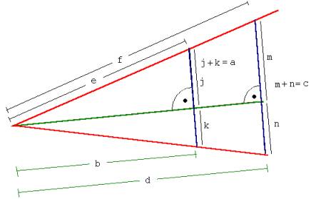 Nun werden die parallelen Strecken so gewählt, dass sie zu beiden Kreuzungsgeraden(rot) schief stehen ( siehe Abb. 2). Es wird noch eine weitere Kreuzungsgerade (grün) eingezeichnet, die mit den parallelen Strecken (Längen c und a ) rechte Winkel bildet. Die grüne Gerade mit ihren Abschnitten der Längen b und d teilt die parallelen Strecken in Abschnitte mit den Längen j, k und m, n.