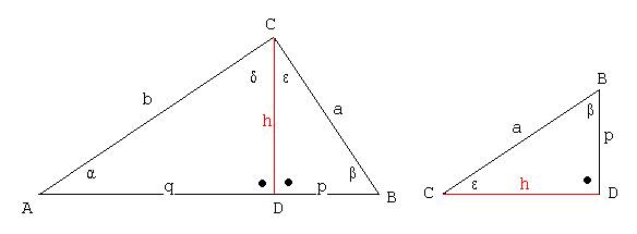 Die Teildreiecke ΔADC und ΔCDB sind einander ähnlich, denn sie haben beide je einen rechten Winkel und es gilt: α = ε; δ = β.
